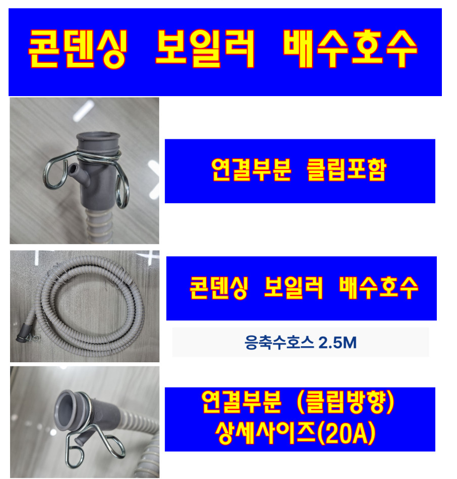 추가로 네이버에 '콘덴싱 보일러 보수 호수'라고 검색해보면 아래와 같이 호수 2.5m짜리와 함께 연결부 클립도 줘서 좀 더 깔끔하게 작업할 수 있을 듯하다. 가격은 택배비 포함 17,000원 정도로 그냥 작업하는 거 보다는 비싸긴하다.